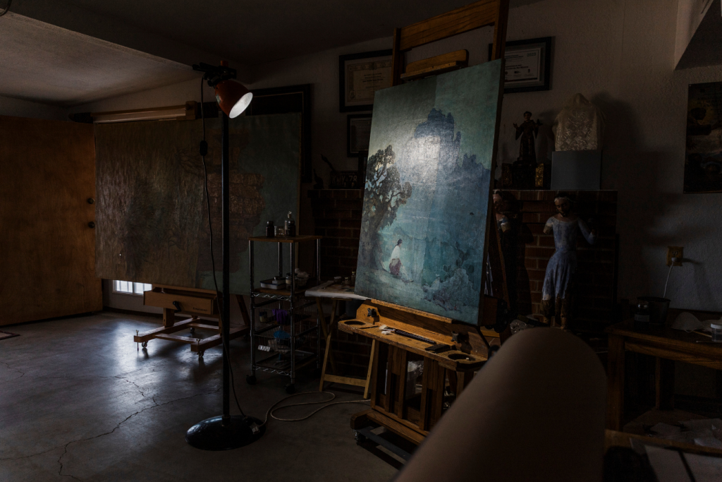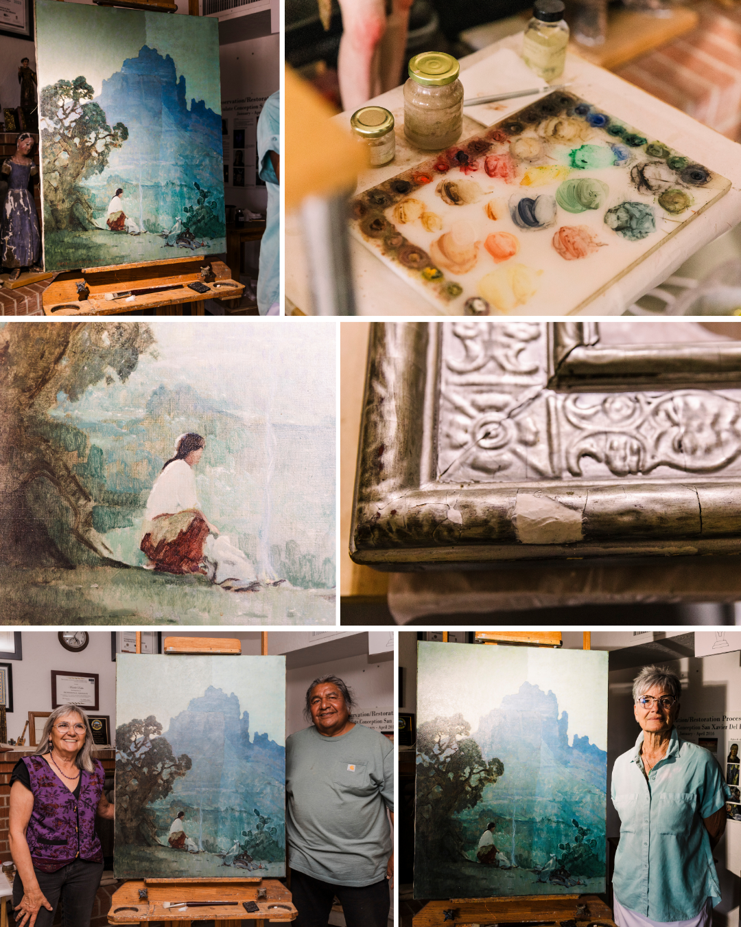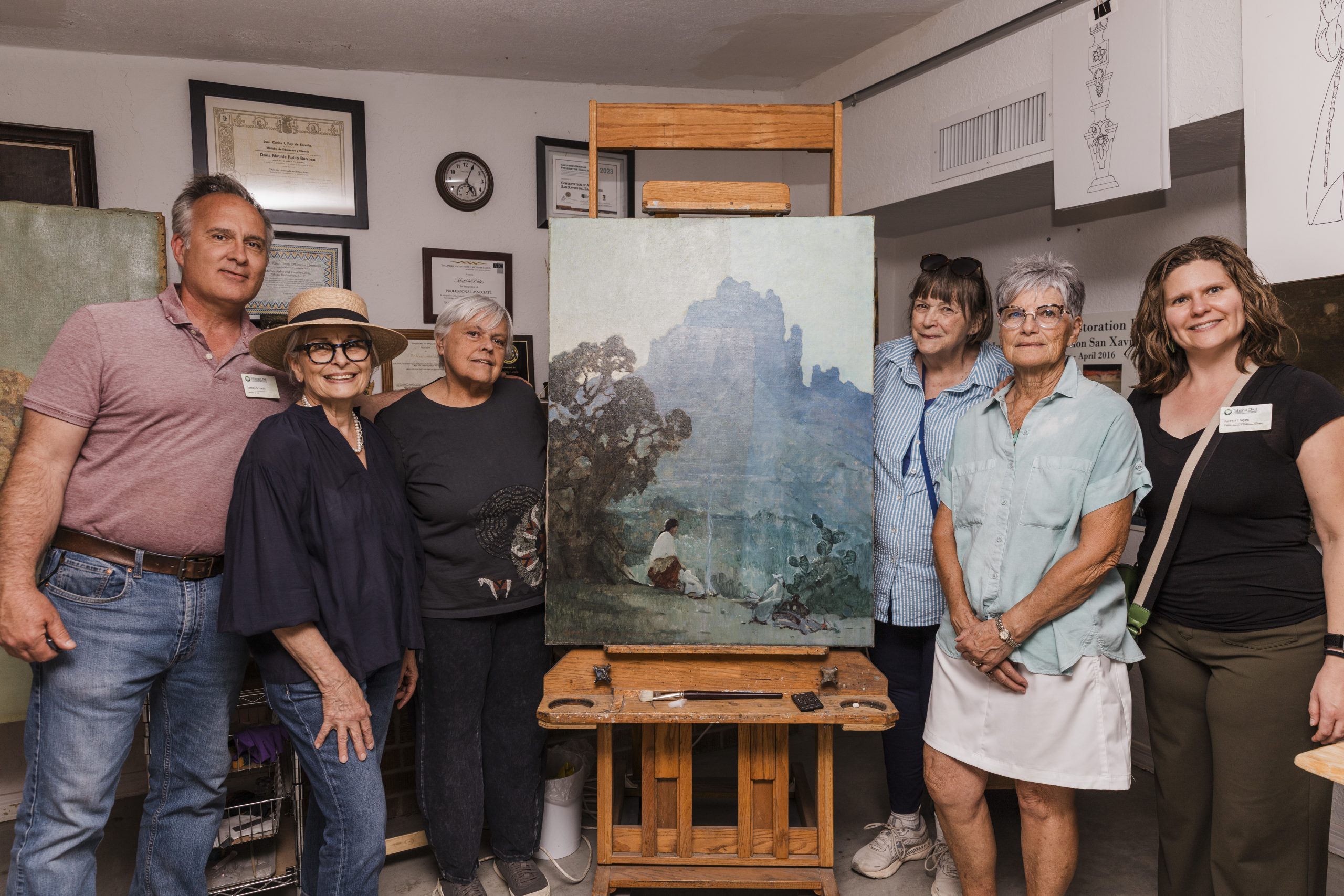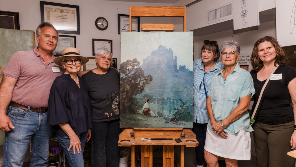 After the fundraising goal was met, Arizona Dawn was transported to Tohono Restoration for treatment. We are grateful to art conservators Matilde Rubio and Timothy Lewis for accepting the project and allowing the painting to remain in Tucson.