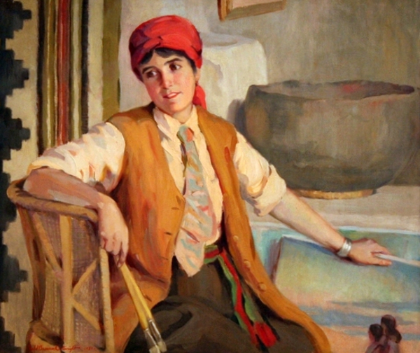 Mary-Russell Ferrell Colton (MRFC) was born on March 25, 1889, in Louisville, Kentucky, and was raised in Philadelphia. She attended the esteemed Philadelphia School of Design. At the age of 15, she was the youngest in her class, where she studied oil painting and watercolor. After graduating with honors in 1909, she opened a studio with one of her classmates. MRFC was a founding member of The Ten, also known as The Philadelphia Ten, a group of American female artists who exhibited together from 1917 – 1945. Their goal was for women to be accepted as professional artists and move beyond being viewed as simply hobbyists. After moving to Arizona, MRFC remained part of The Ten and exhibited with them regularly through 1940.
