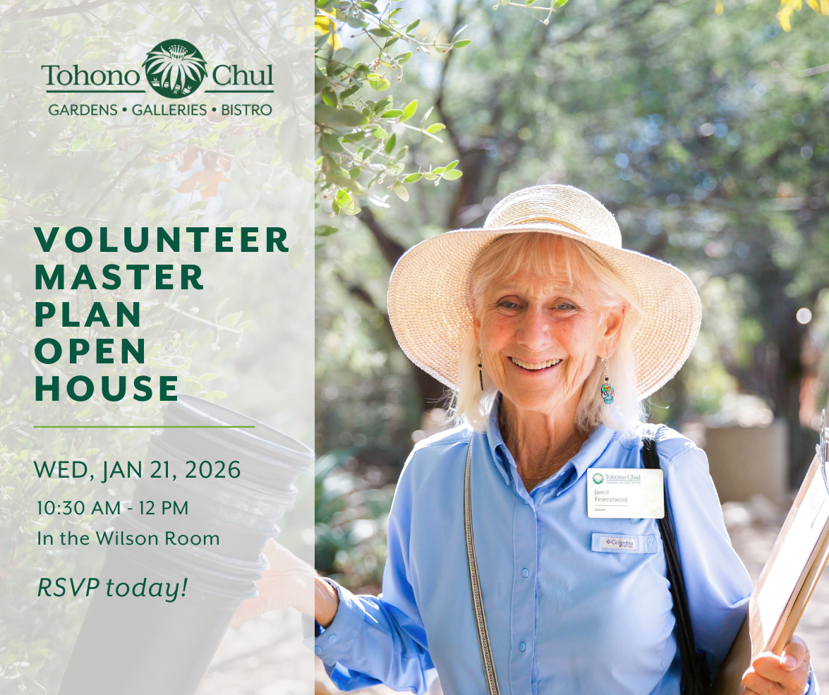 At this special Open House, you’ll have the chance to explore Tohono Chul’s first master plan in over 20 years! Share what you love about the gardens, offer your ideas for the future, and connect with fellow volunteers. Enjoy light refreshments and join in discussions about how Tohono Chul can continue to inspire, educate, and serve Tucson for generations to come.